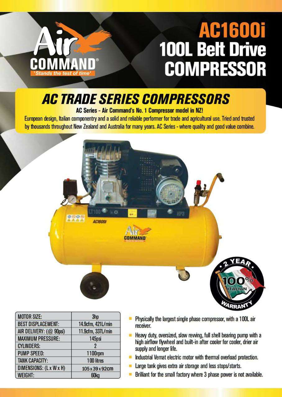 Air Command 3HP Belt Drive Compressor 100L Tank, AC1600i