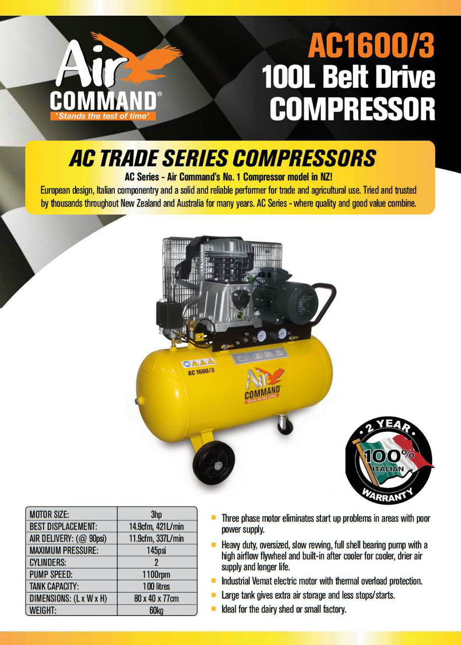 Air Command 3HP Belt Drive Compressor 100L Tank, AC1600/3 is backordered and will ship as soon as it is back in stock.