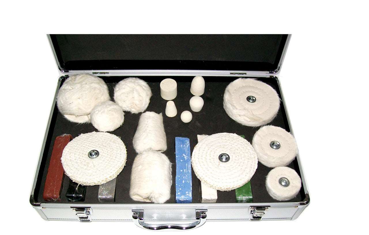 This incredibly convenient kit includes a variety of mops and wheels for cutting, intermediary polishing and final polishing of both ferrous and non ferrous metals.