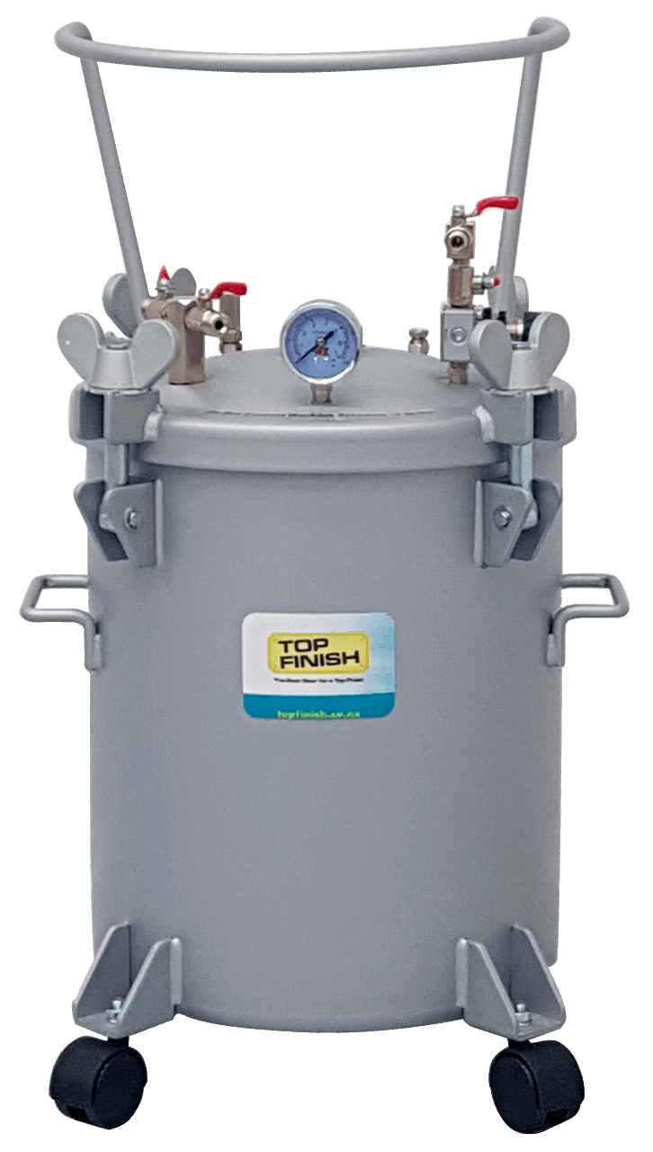 A Pressure Pot used with a spray gun and hose set has the following features: