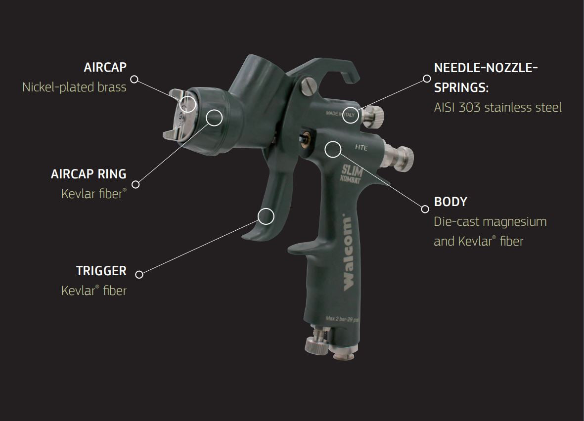 A unique spray gun in its conception, which combines the tradition of the time tested product of the Walcom Slim with the patent pending technology lightness of a magnesium body over-injected with Kevlar fiber.